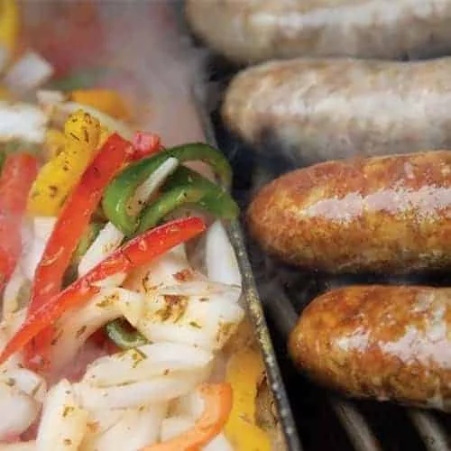 Sausage and Pepper Mixed Grill Grill toppers are a great way to cook on your barbecue. They are versatile, allowing you to cook breakfasts, and even bake! This recipe makes great use of the Griddle style topper, by letting you cook your veggies “fry-up” style while cooking the sausages on the cooking grids.