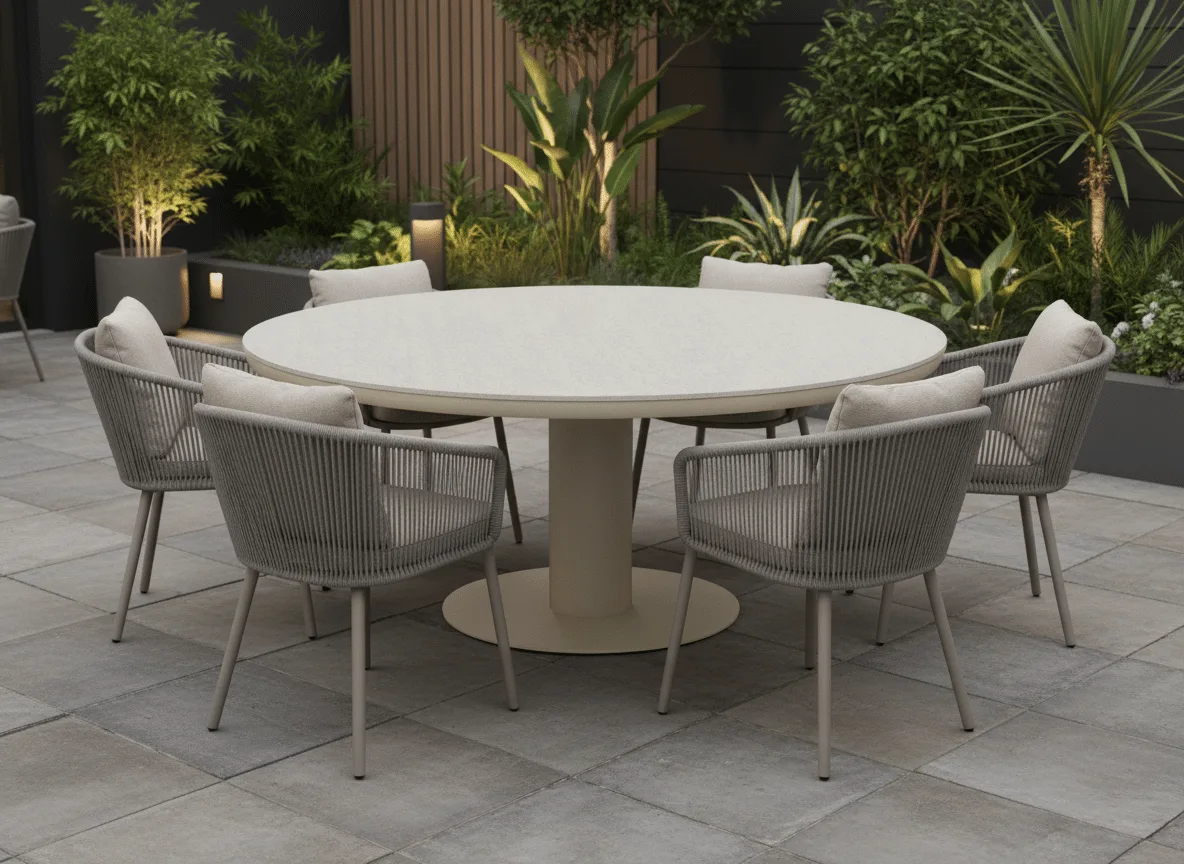 The sintered stone tabletop has a natural, refined look that sits beautifully within garden surroundings. Paired with a beige aluminium pedestal base, the table feels grounded and elegant rather than heavy or formal. Because the base uses a central column with a circular plate, it leaves plenty of legroom, making dining more comfortable for everyone around the table.