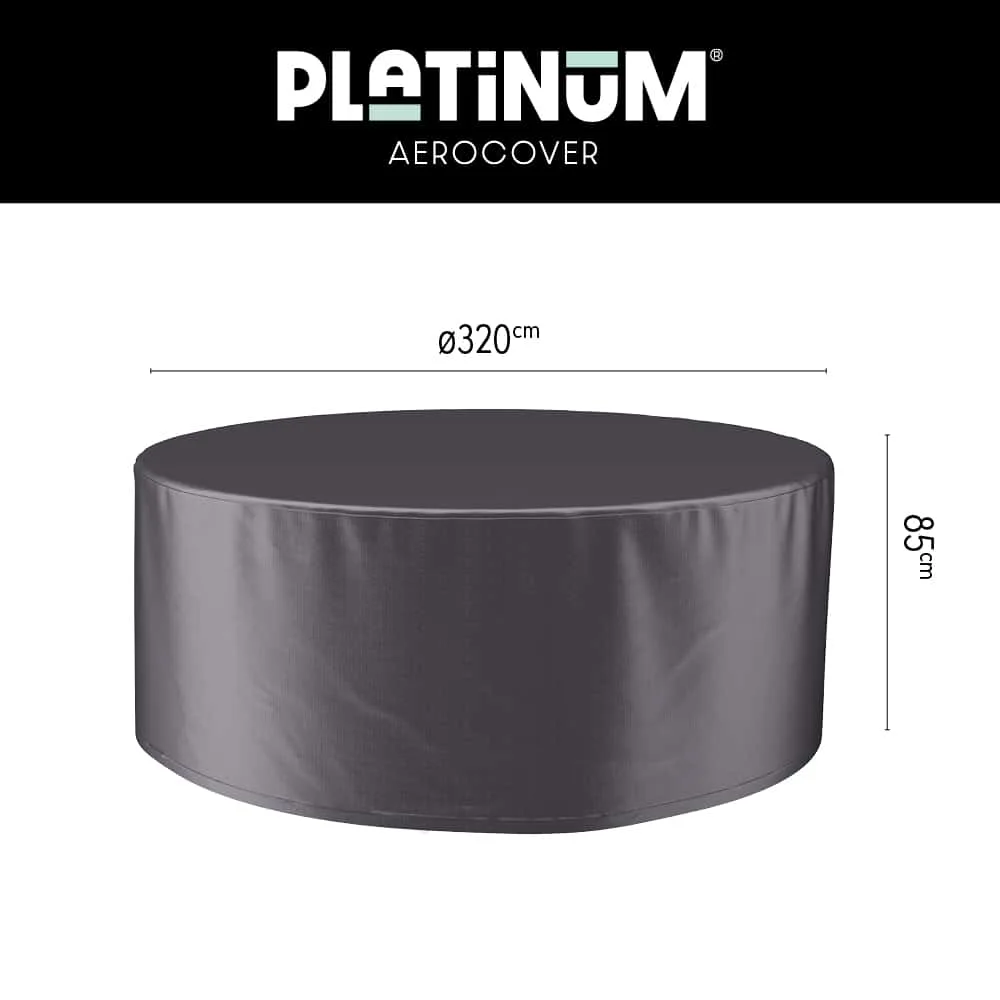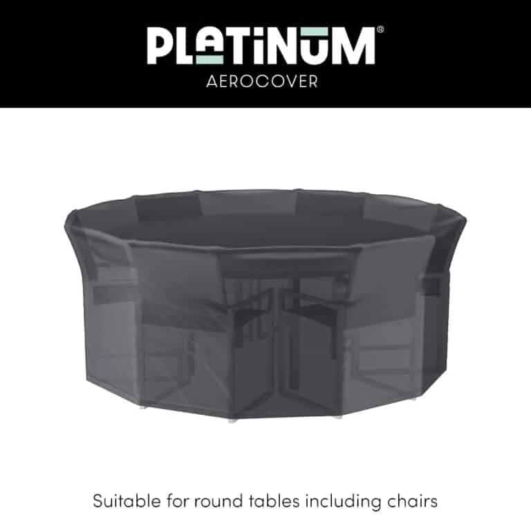 Introducing the Platinum AeroCover Garden Furniture Cover: a breathable, water-resistant cover designed to protect your round tables up to a diameter of 320cm from the elements, extending its lifespan. Includes drawstring, stoppers, and storage bag.