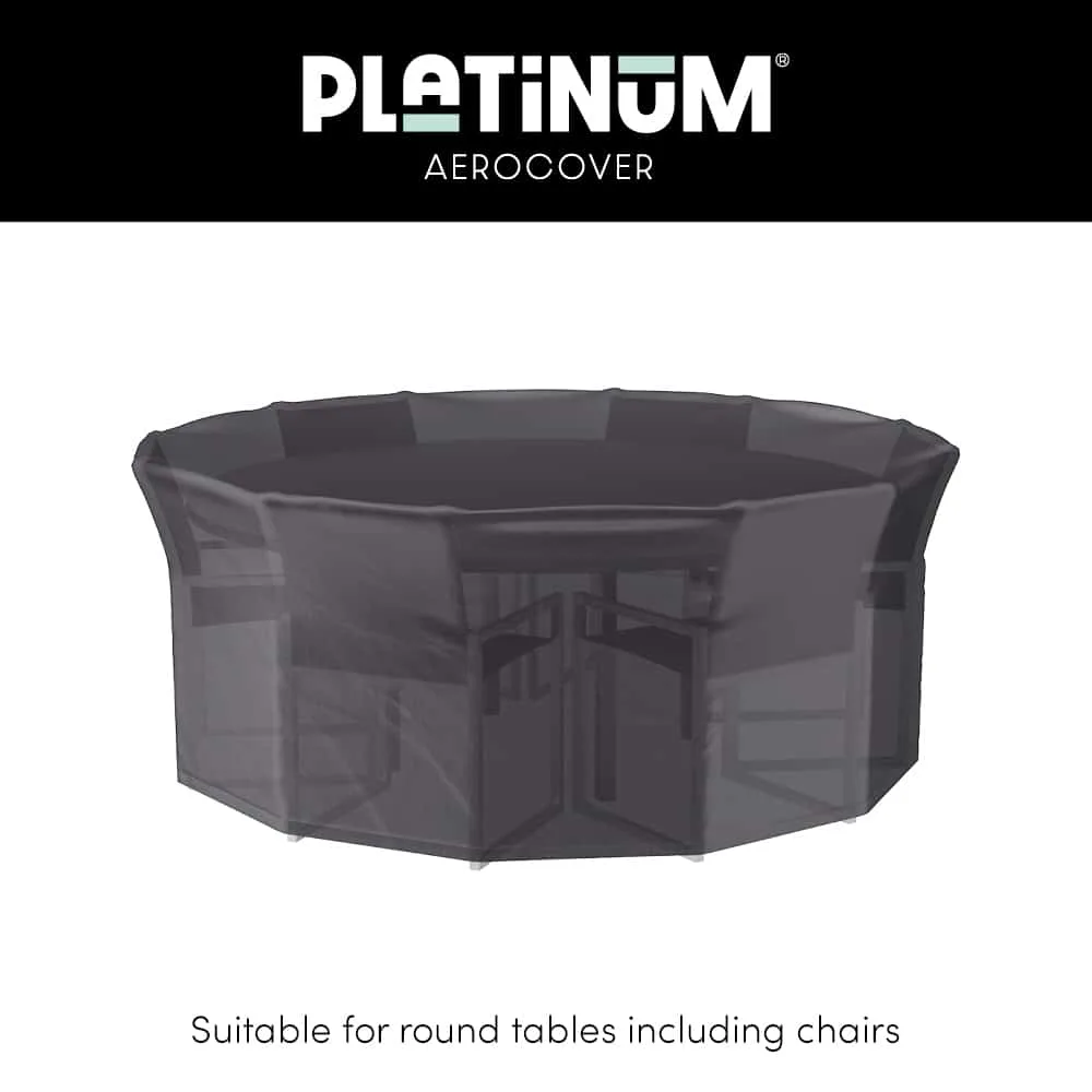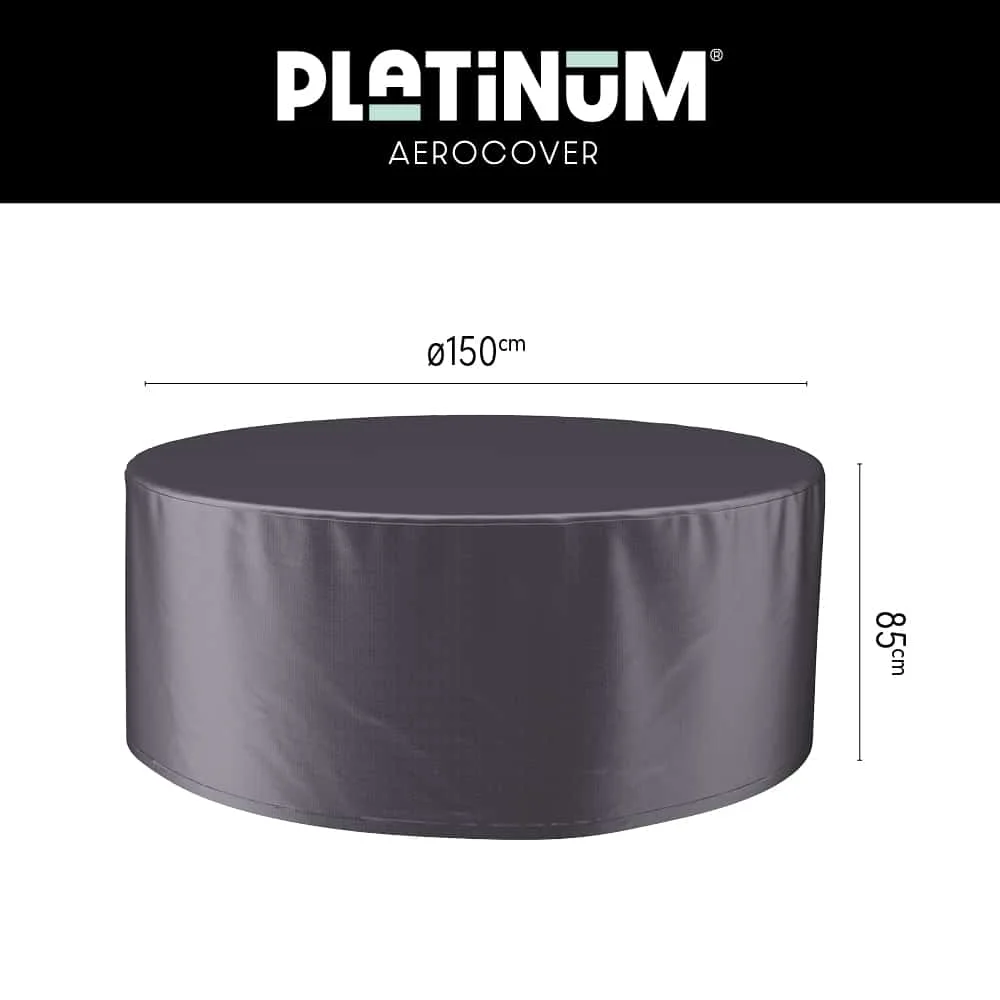 Introducing the Platinum AeroCover Garden Furniture Cover: a breathable, water-resistant cover designed to protect your round tables up to a diameter of 150cm from the elements, extending its lifespan. Includes drawstring, stoppers, and storage bag.