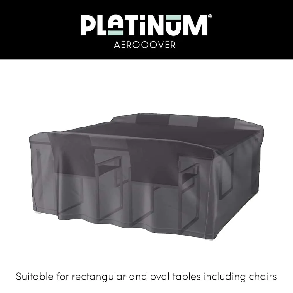 Platinum AeroCover rectangular-shaped is a breathable, water-resistant cover designed to protect your dining set from harsh weather conditions, extending its lifespan. Includes drawstring, stoppers, and storage bag.