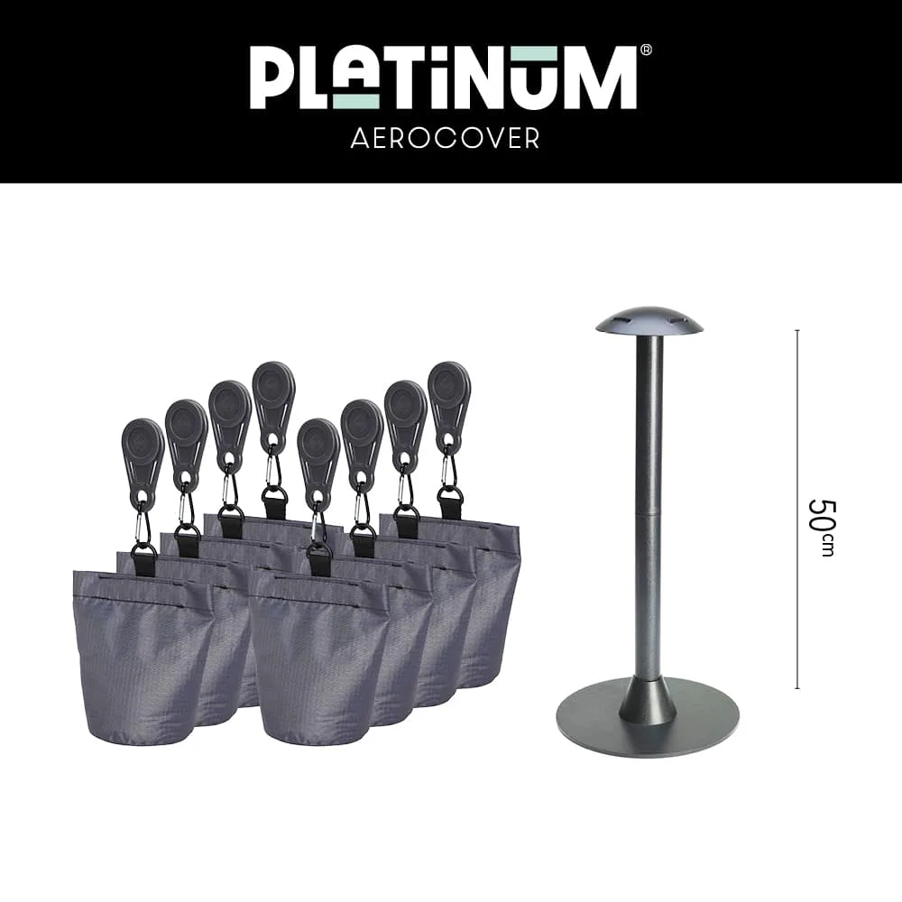 The AeroCover Cover Support Pole Set includes a support pole and eight sandbags. This set prevents water pooling on garden furniture covers, ensuring water runs off efficiently and maintaining distance from the table top. Ideal for preserving the integrity of your furniture and covers.