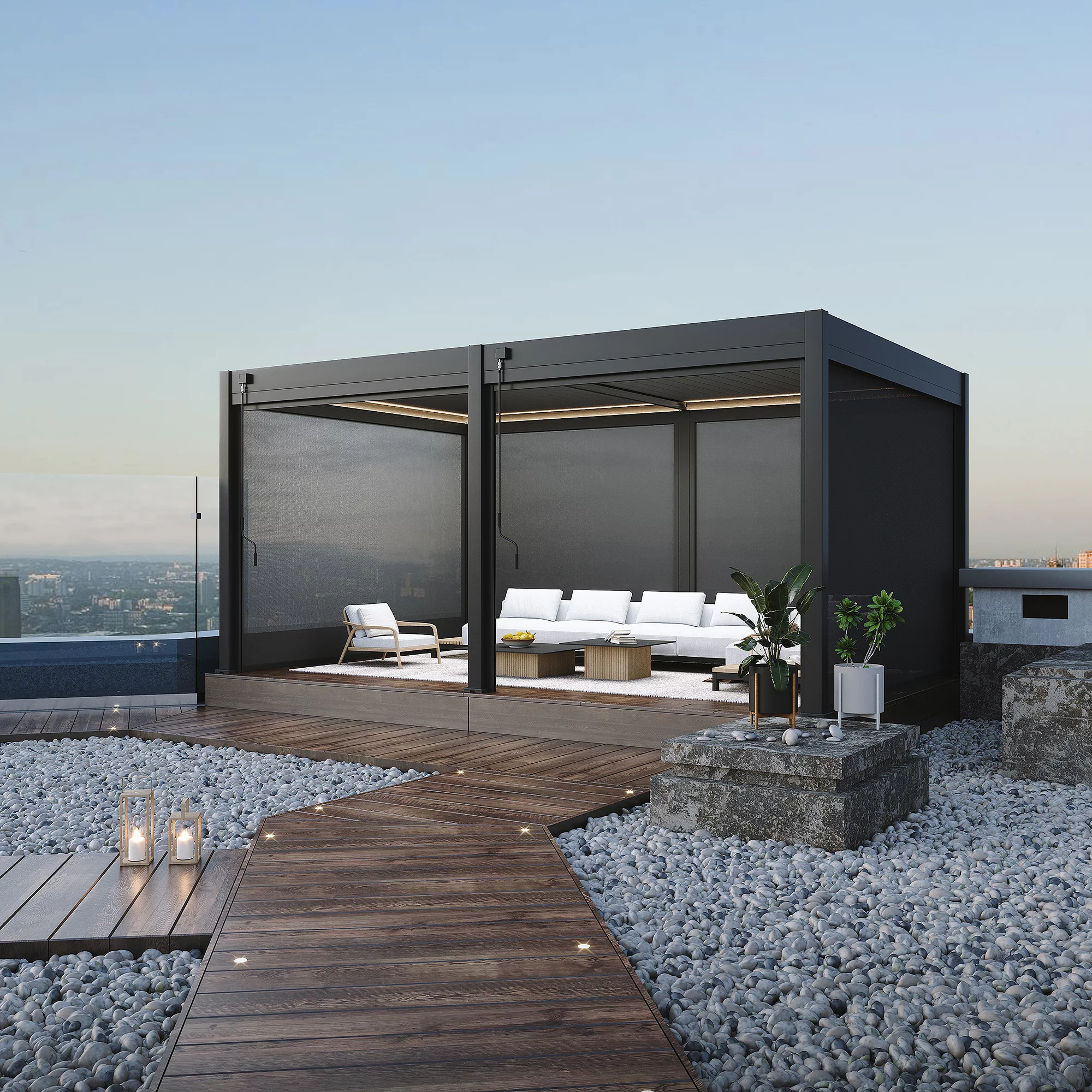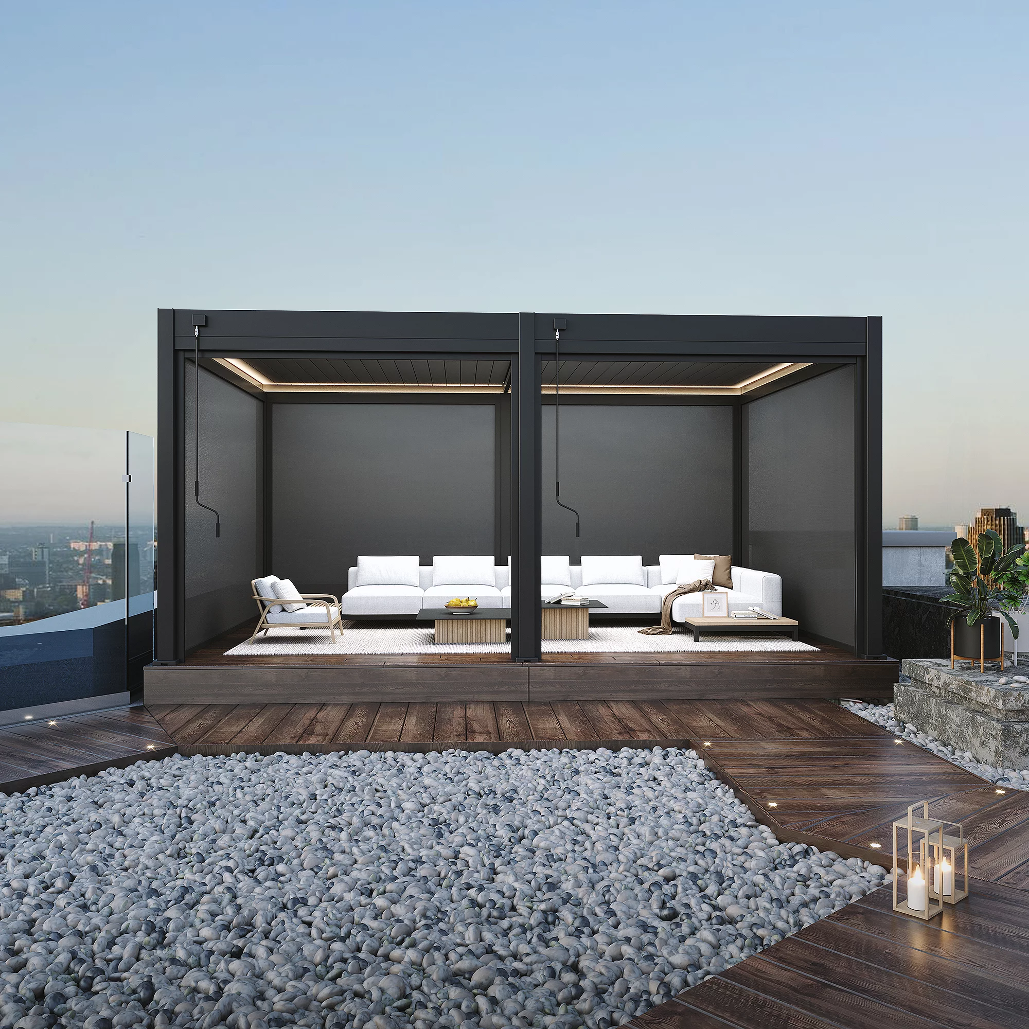 This pergola's crowning feature lies in its adjustable aluminium louvers, enabling you to tailor your outdoor experience to your liking. The ingenious design features an invisible joint between the connecting bars and louvers, preserving the frame's sleek appearance even as the louvers rotate seamlessly. These adjustable louvers allow you to orchestrate the perfect balance of sunlight, shade, ventilation, and rain protection. Whether basking in the sun's warm glow or seeking refuge from a sudden downpour, the Pergola empowers you to control your outdoor environment with ease.