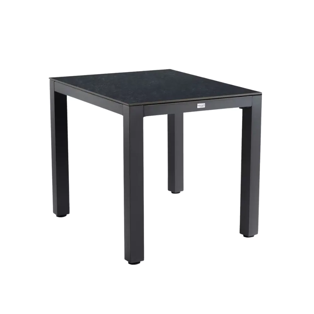 The table's exquisite Trespa graphite tabletop offers the pure aesthetic of ceramic with the strength and durability . A perfect bistro table table is suitable for all year round enjoyment. The square design & charcoal frame adds a touch of timeless elegance and reflects light beautifully, creating a sophisticated and inviting atmosphere.