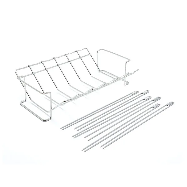 A brilliant way to cook kebab skewers, ribs and roast poultry. This multi function set acts as a rib rack, kebab set and a roaster. With stainless steel construction, this set is easy to clean and maintain.