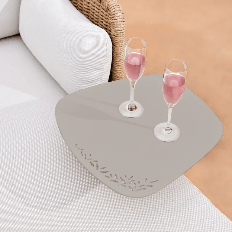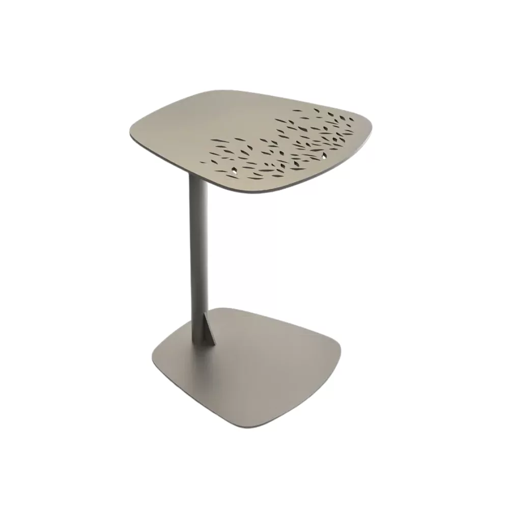The Dorcas Side Table made of durable and weather-resistant powder-coated aluminum in Champagne colour, integrates into any contemporary outdoor space, adding a touch of elegance and sophistication. Dorcas Table effortlessly fits under most sofas or armchairs, adding versatility to any living space.