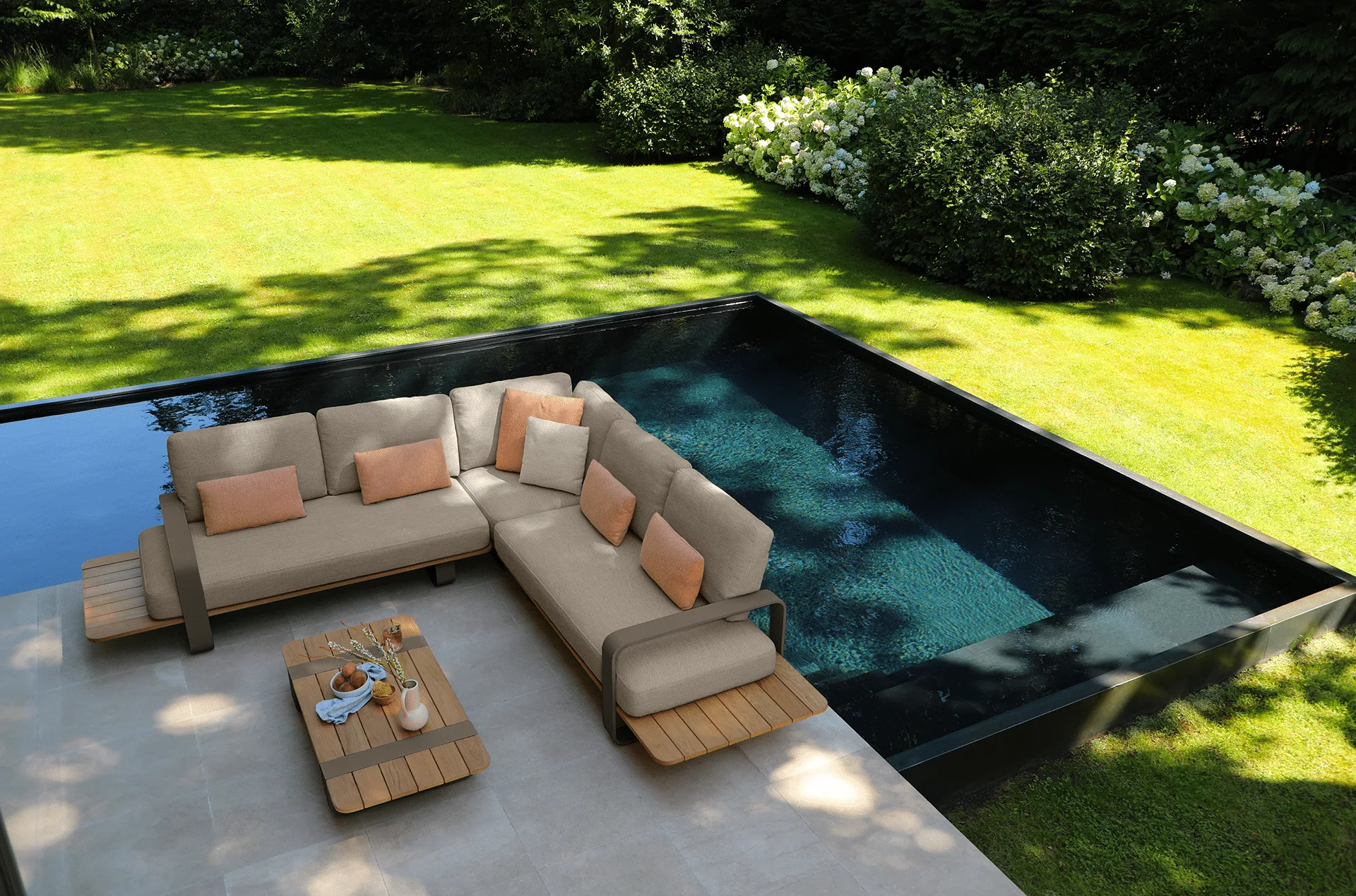 A truly unique outdoor furniture collection, the DOX Corner Sofa Collection Patio Furniture Set is exclusive to The Outdoor Scene designed with a unique fusion of European and Asian design sensibility. Featuring a durable aluminum frame across all furniture, this set derives its name from the soft rounded contours of the frame and cushion design. the tubular legs lie sulkily below the seat allowing the sofa to seemingly float above the ground. With is unique integrated teak side tables it surly attracts attention. Available in two beautiful configurations.