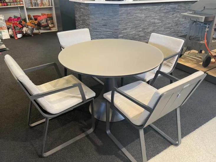 A superb dining table with. The Fano 150cm round table with a durable 8mm cappuccino colour glass top, elegantly rests on the tastefully designed charcoal centre pedestal. The Fano Dining set provides a sturdy circular outdoor dining table ideal for get-togethers, parties and barbecues. This outdoor dining table is built with high-quality aluminium which is powder-coated for resilience and is made to last. Capable of handling the outdoors, while also designed to look elegant and appealing. The charcoal finish adds a contemporary style and suits almost any outdoor garden or barbecue space.