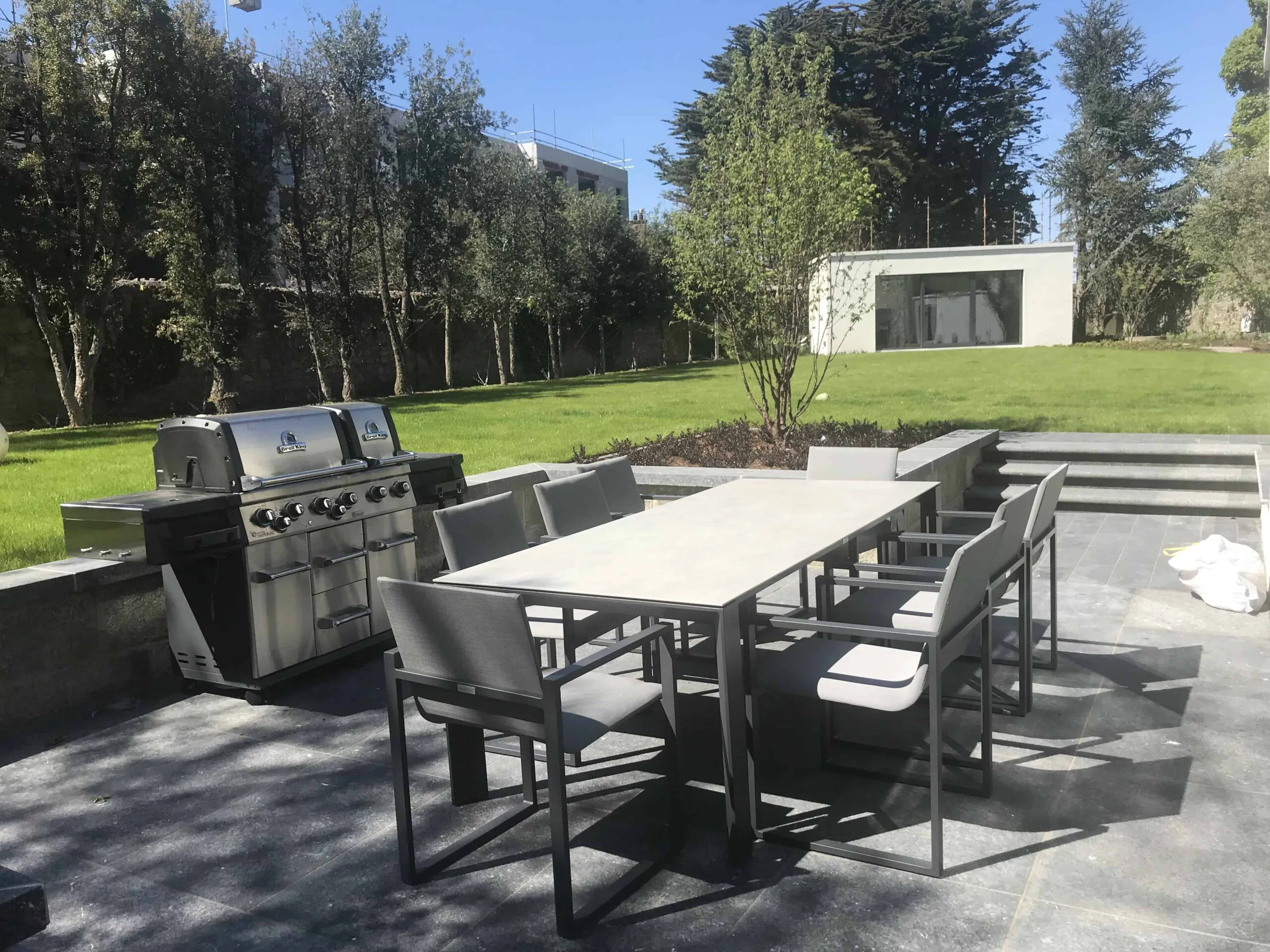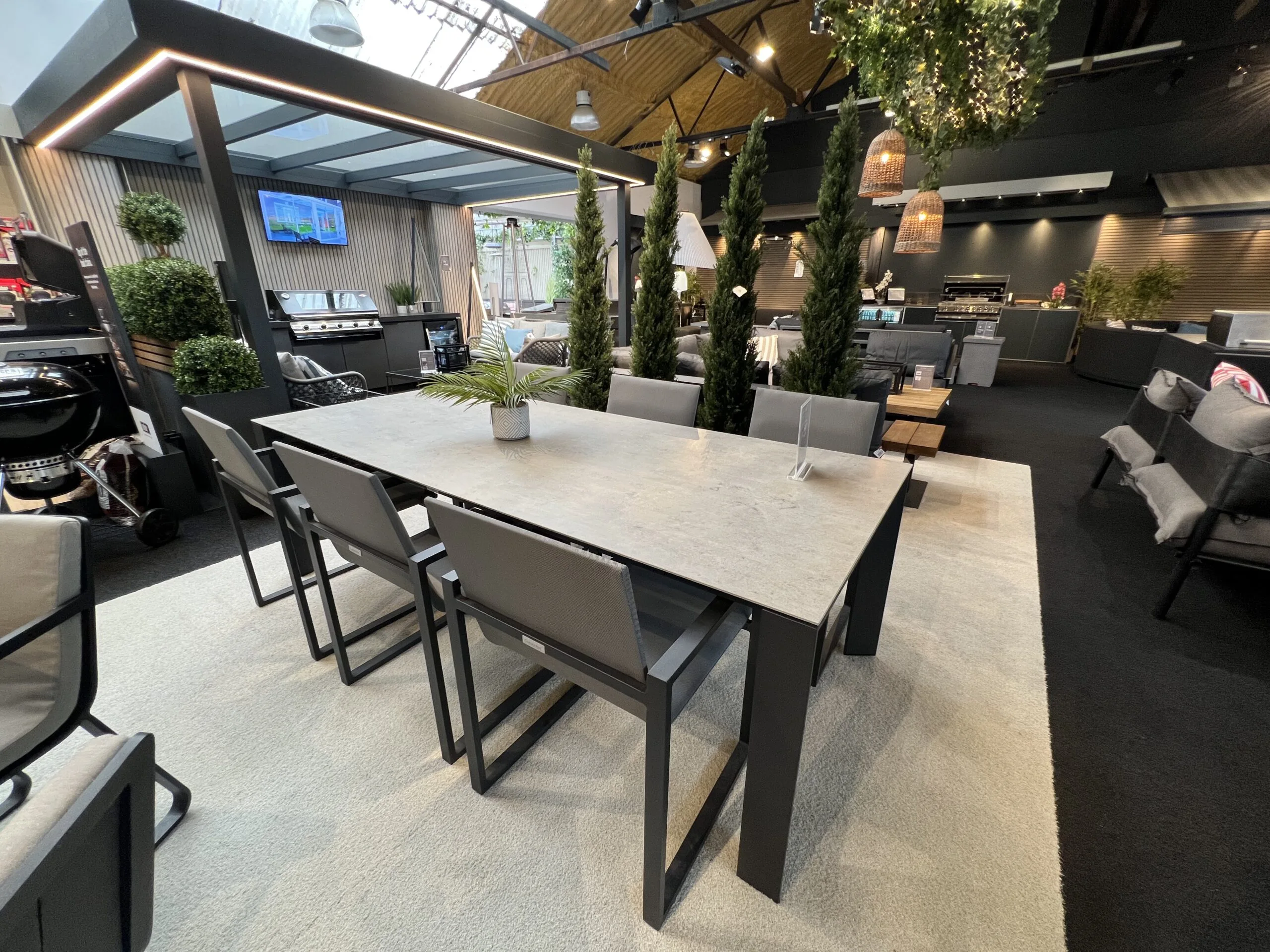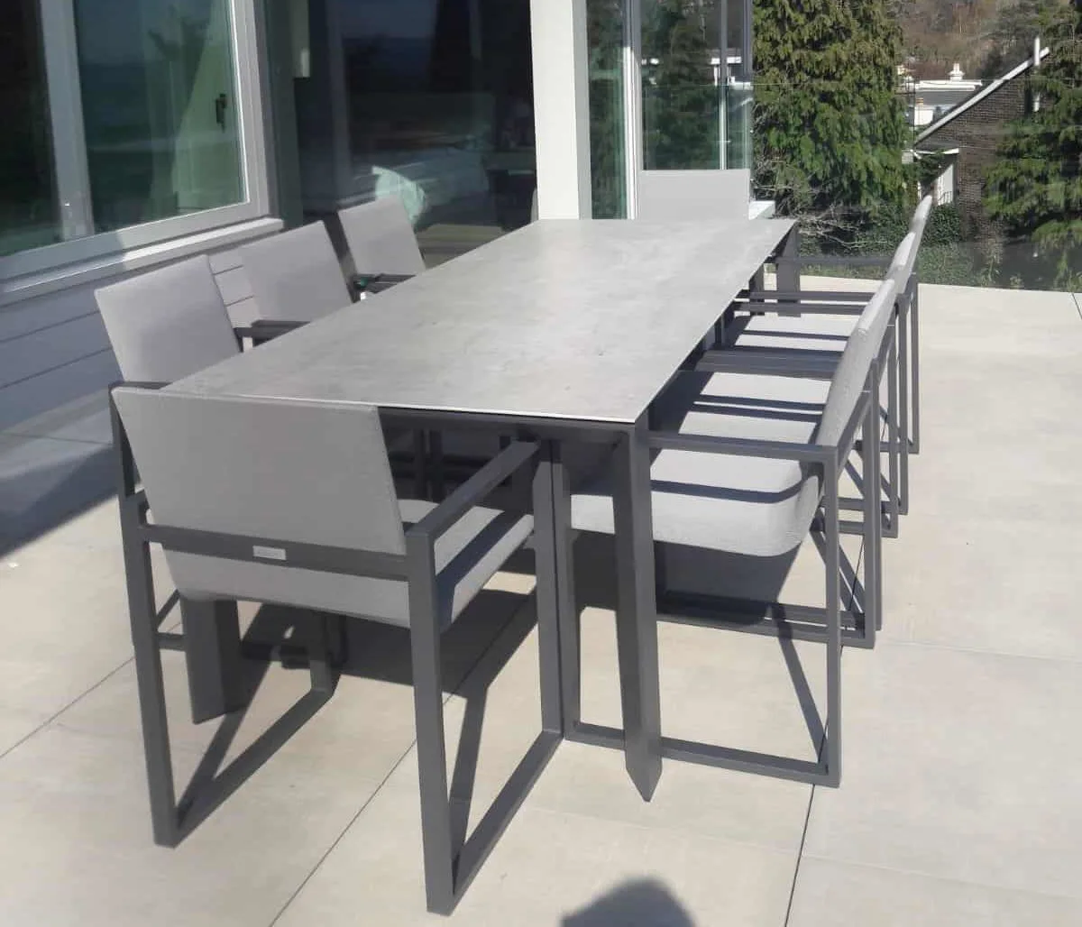 A sleek and sophisticated dining table. The Fermo is made with a modern aesthetic in mind that is perfect for a garden get-together while also bringing a stylish centerpiece to your garden. Perfectly angled to fit your design goals, this table has been a popular product at The Outdoor Scene and we are pleased to make it available this year with a brand new colour. This table's structure is made from tough and durable aluminium with a powdered finish. The table also comes with a modern ceramic countertop with a marble-like finish. This set contains 8 chairs which are also made from the same strong and durable aluminium and distinctive modern style. While also bringing alongwith weatherproof rated fabric. Built to the highest possible standards. This 220cm long table is an essential addition to the home of anyone who wants to dine in style.