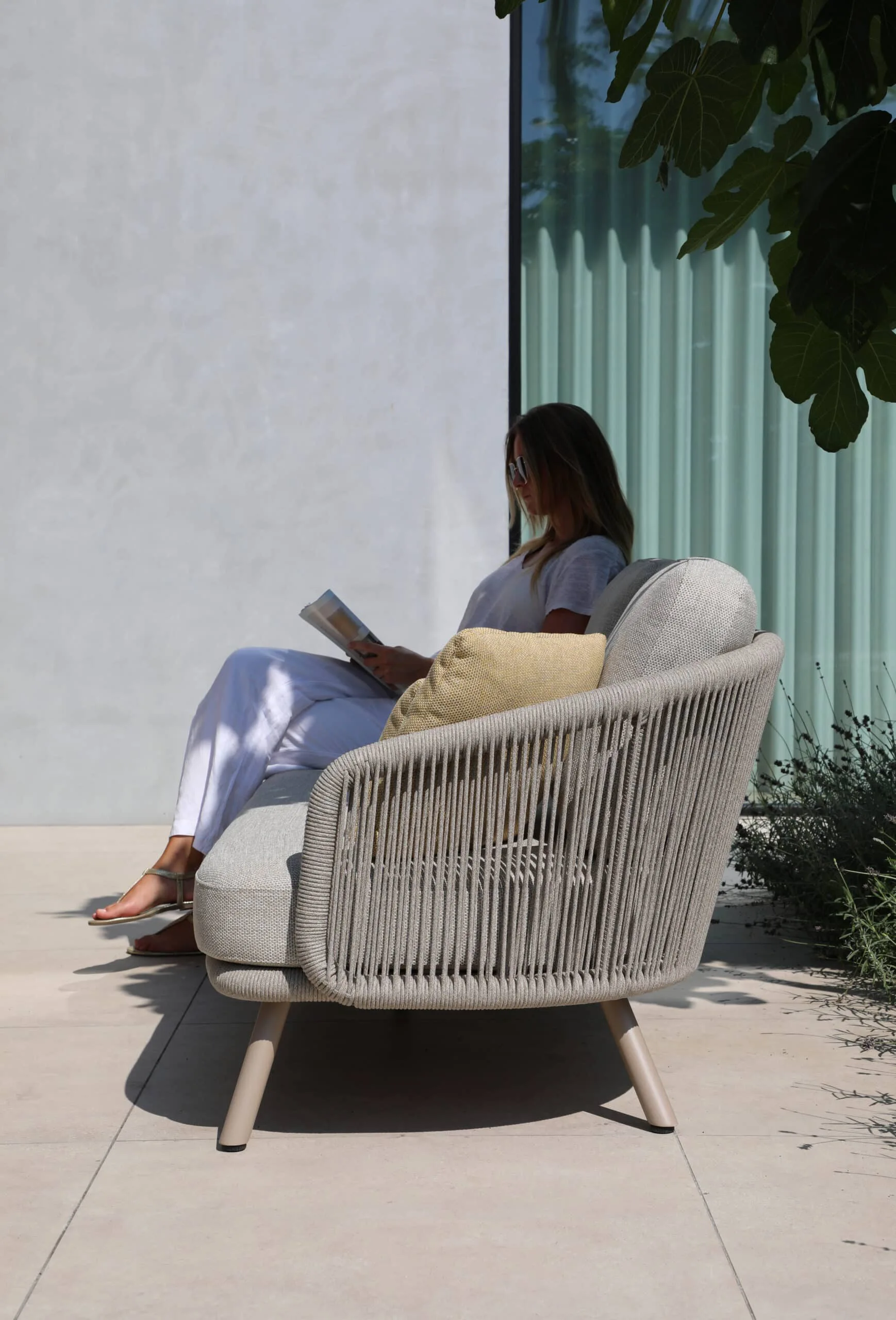 Crafted with precision, each piece features a powder-coated aluminium frame finished in an elegant taupe tone. The signature 6mm vertical Olifen rope weave adds a refined design element, casting beautiful shadows when touched by sunlight. Whether you have a modern deck or a classic patio, this outdoor sofa set adapts effortlessly to your style.