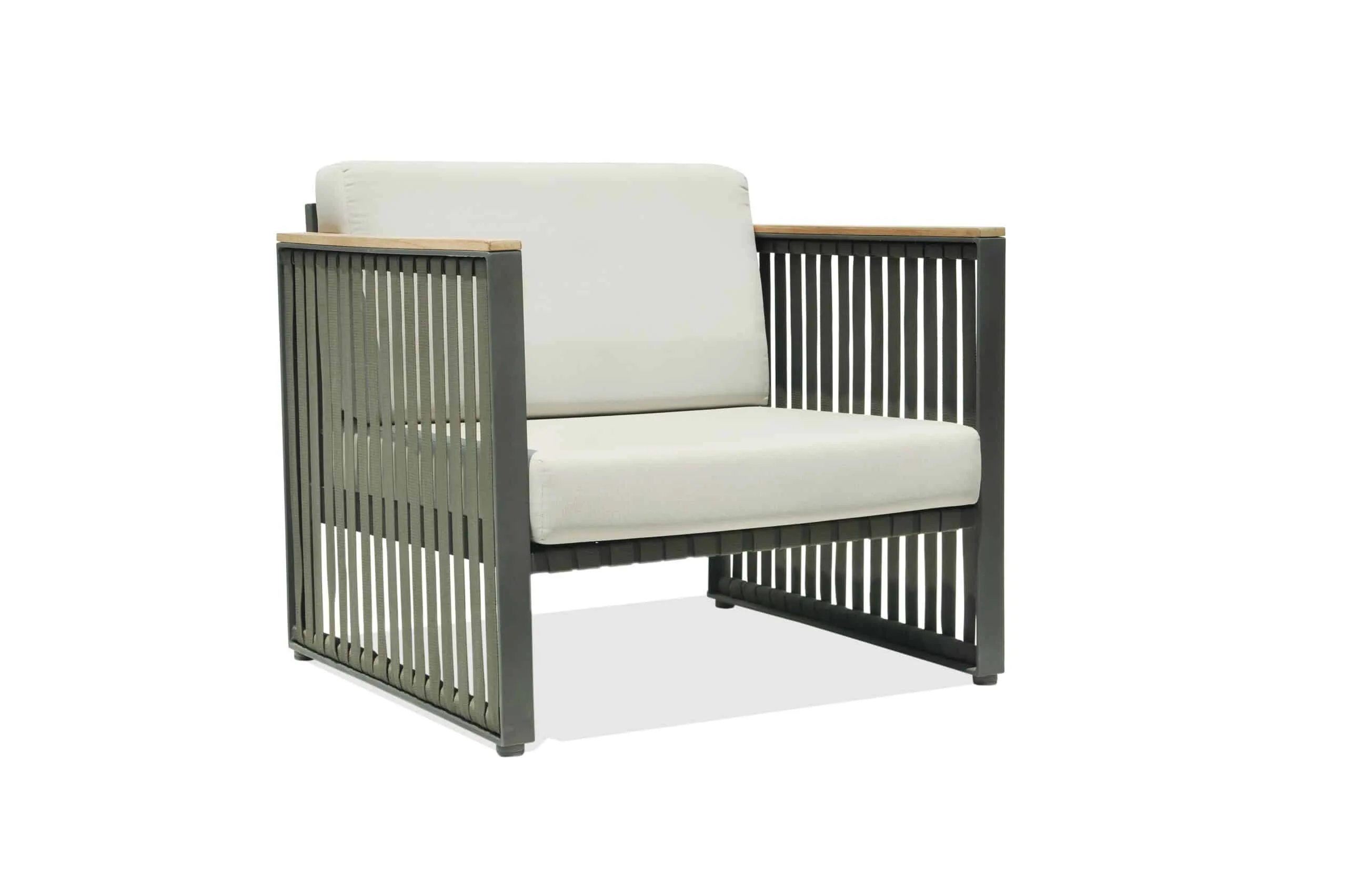 A sleek and modern armchair, the Copacabana armchair's modern design will immediately turn heads. Coming on a unique square frame design, this chair includes open weave sides, on a teak wood base on a powder-covered aluminum frame. The Copacabana also has weatherproof fabric upholstery on its cushions for superb comfort and durability. A stylish way to enjoy your garden and patio.