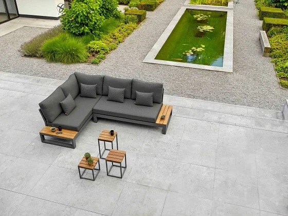 A brilliant, vibrant garden lounge set, the Soho outdoor chaise is a stylish way to enjoy your garden all year round. With its exceptional weatherproof construction. The base is made of treated aluminum for a superb, strong finish and the cushions are upholstered with modern fabric that can withstand a rain shower (though a furniture cover/cushion bag is recommended). It features a chaise bench with its teak-topped table on the right side and an additional couch on the left. This set has an aluminum base that's easy to clean and maintain. A wonderful way to spend your days and evenings in the garden. The Soho set is a perfect garden companion.