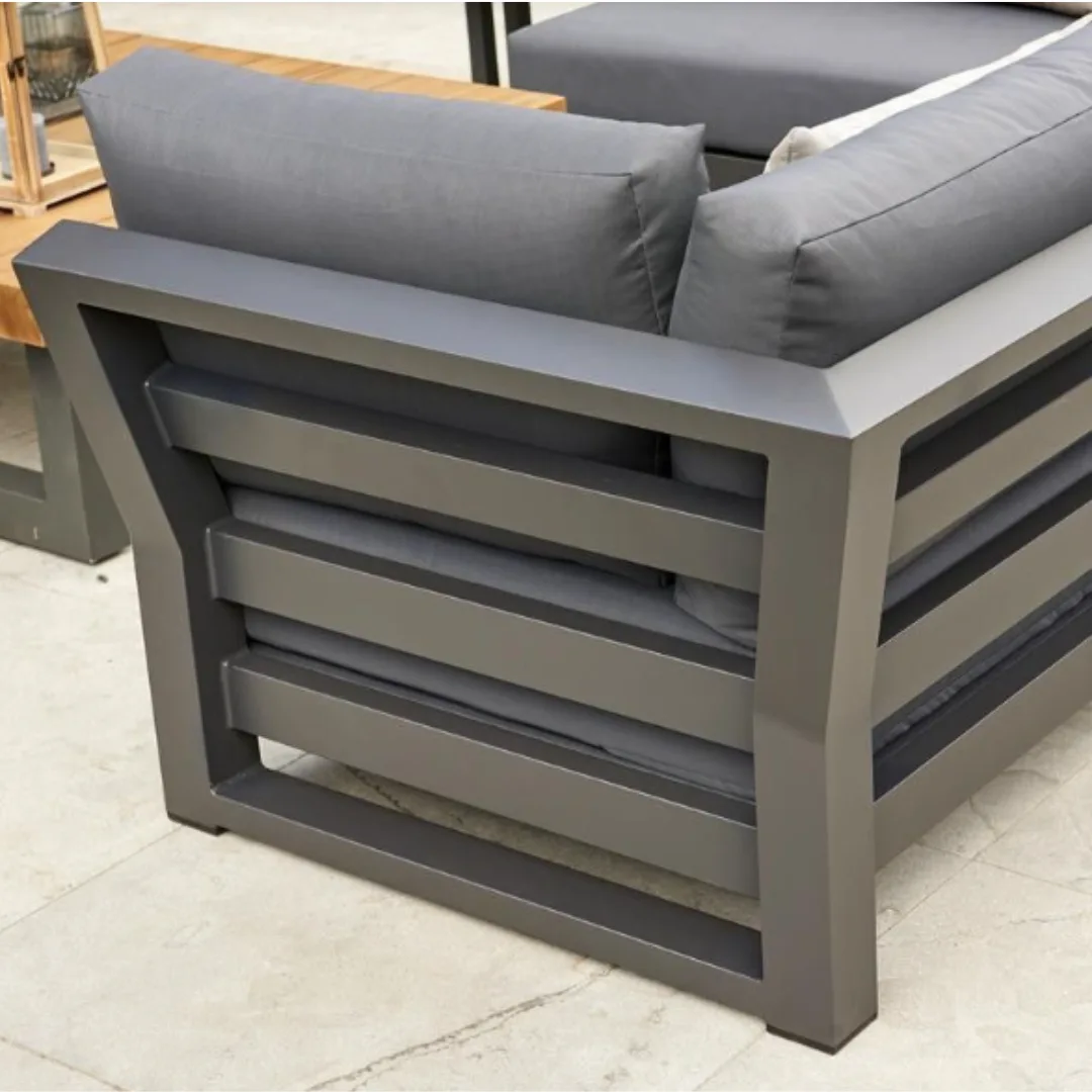 The Nevada Corner Set is a meticulously crafted furniture set with exceptional construction. This corner set boasts both comfort and durability, designed with a keen eye for style. Constructed using exceptionally long-lasting aluminum, this sofa set promises longevity and reliability for years to come.