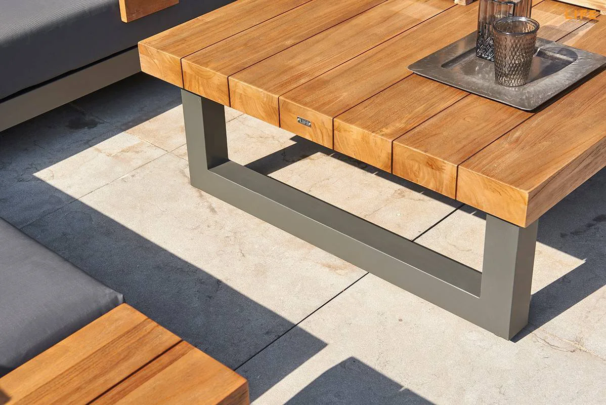 Stunning contemporary outdoor teak-top coffee table made from sustainably sourced wood. This luxury teak table has plenty of space for some delicious food and drinks.