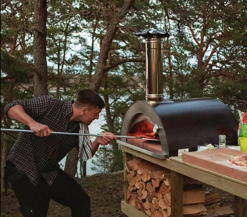 The oven is equipped with a reinforced, polished stainless steel chimney pipe, a stainless steel door with a beechwood handle, and a built-in thermometer for precise temperature control. The 40mm terracotta clay brick oven floor ensures even heat distribution for perfect cooking results every time.