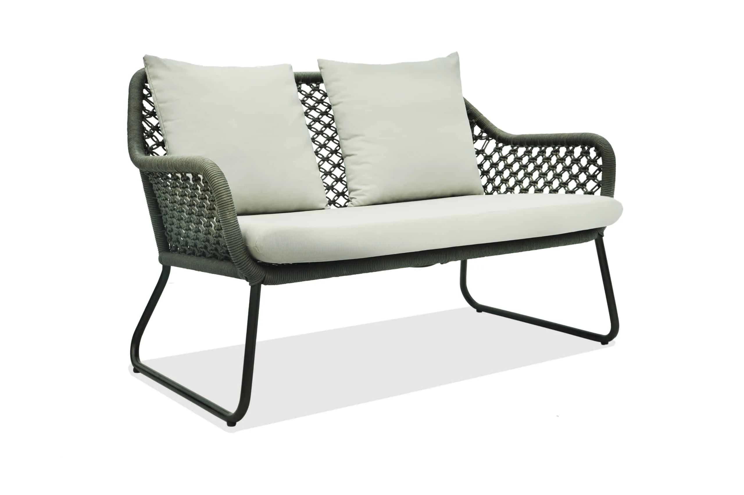 A comfortable and aesthetic two-seater sofa, made from the finest materials. Built using a strong aluminium base, this furniture features a weaved polyrope backing for strong support. The carbon lacquer and anthracite rope emphasise the modern and timeless look. The cushions feature Sunbrella fabric for excellent protection against sun fade and water repellent.