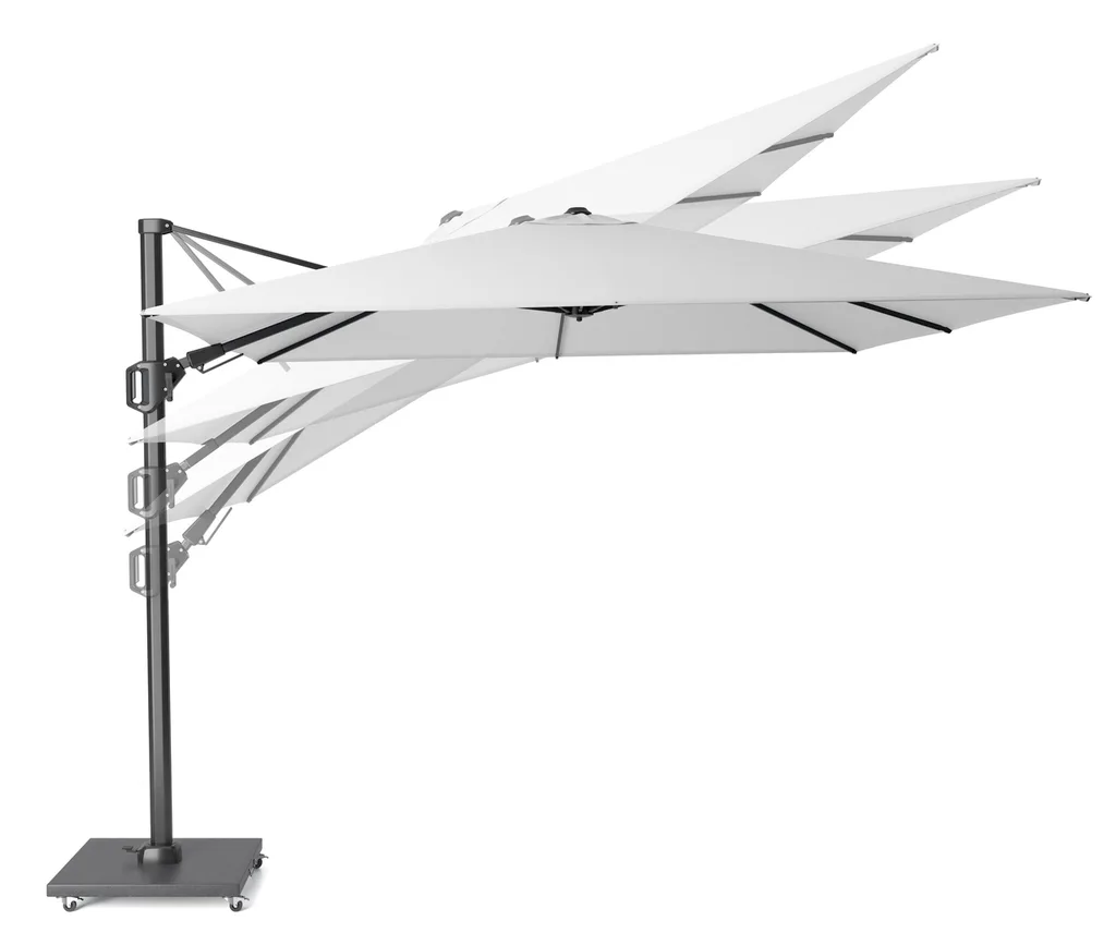 All side elevated parasols require a substantial base to stop them from blowing over if the wind should catch them. Challenger is no different. The Modena 90kg granite base is best suited for this garden parasol.