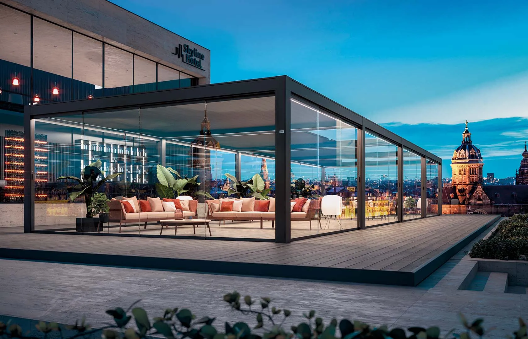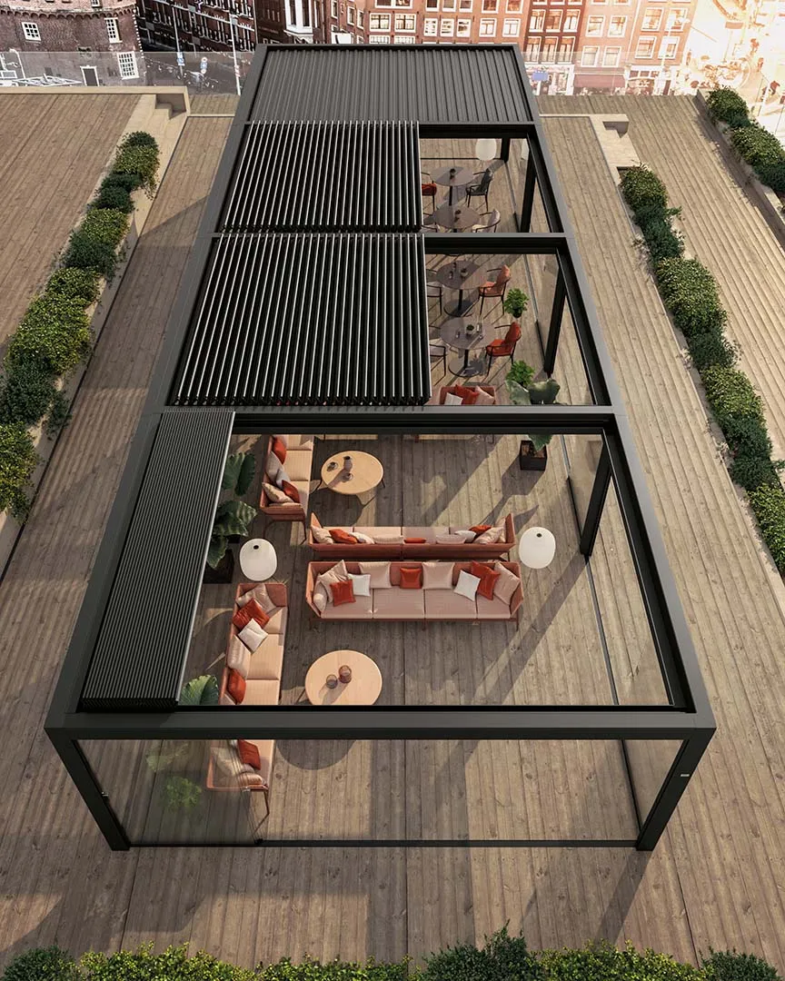 Vertical awnings and perimeter glazing allow you to enjoy the outdoor space all year round. The pergola can also be customised in colours and configurations, LED lighting, modular furnishings and power sockets.