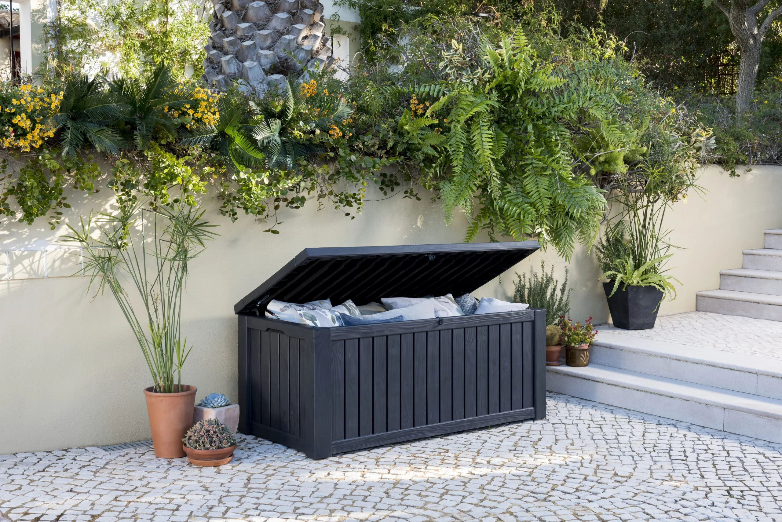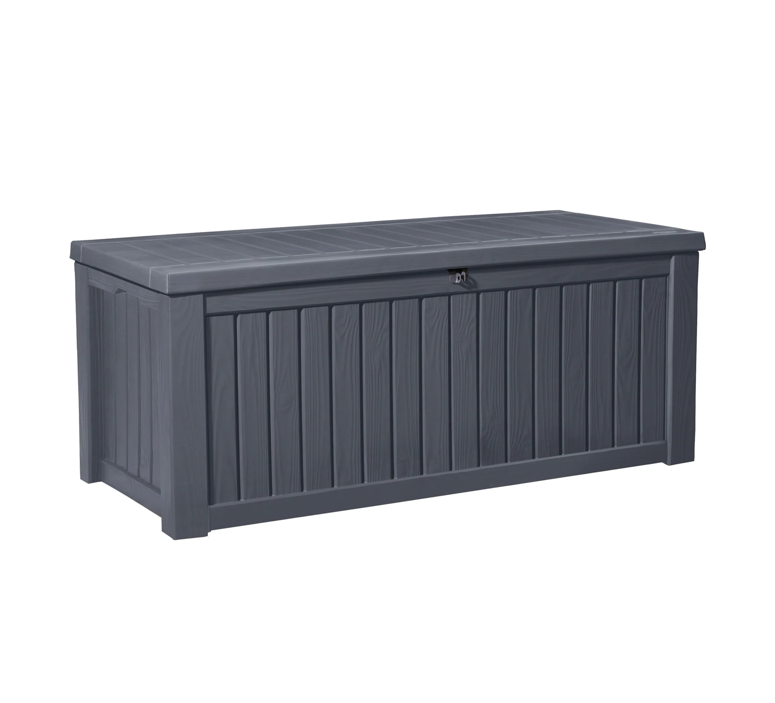The Rockwood outdoor storage box is weather-resistant and robust enough to use as seating. The lid uses a slow-close piston and has a catch for a lock (not included). The Rockwood offers a generous 570 liter capacity storage for garden equipment, cushions, toys, and bird feed. It can even be used to keep the pool and hot tub accessories handy.