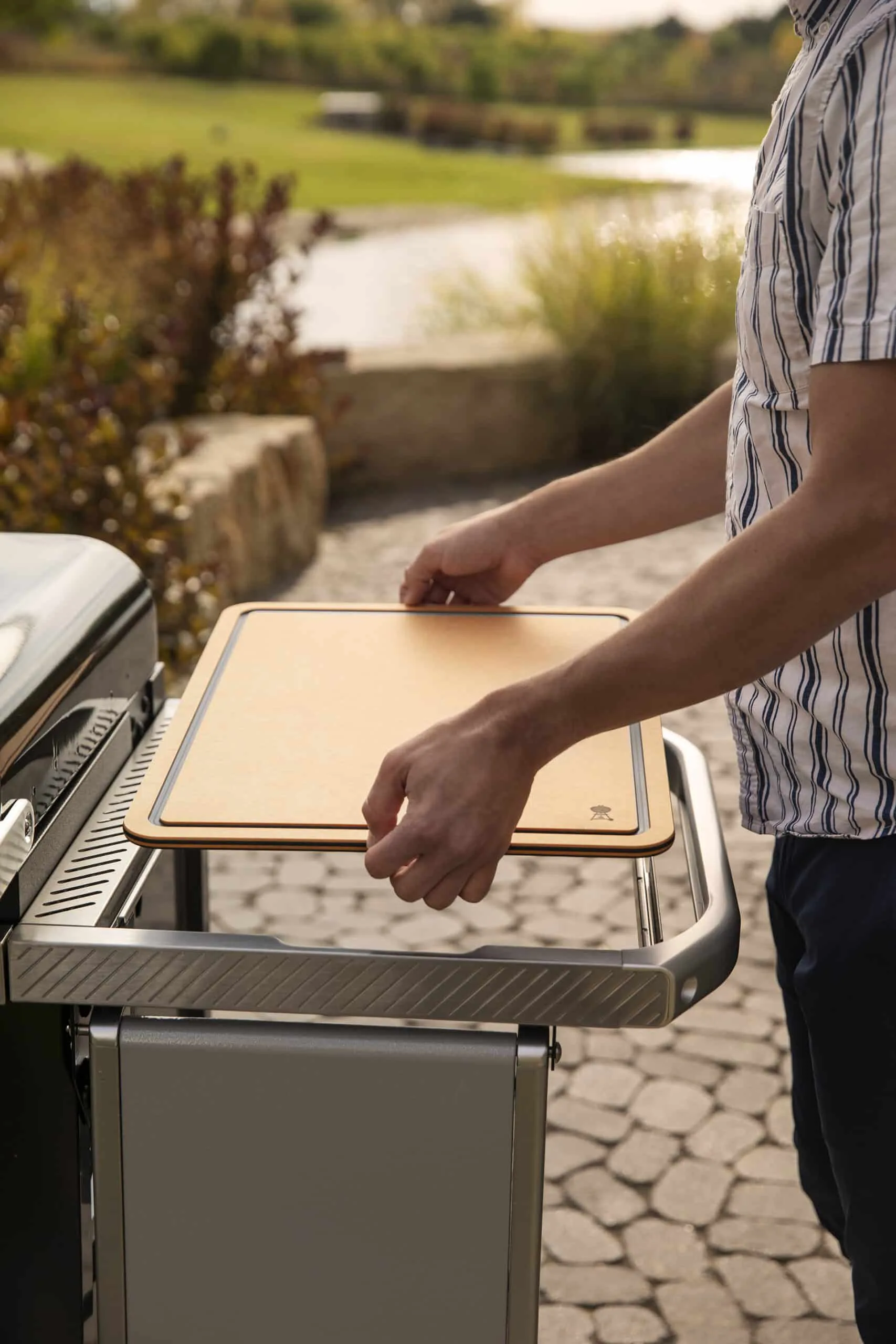 The cutting board is part of the Weber Works Prep, Cook, and Store System, made to enhance your grilling setup. Just drop it into the side table of your SLATE griddle or compatible stand, and you're ready to prep, serve, or carve—all in one spot.