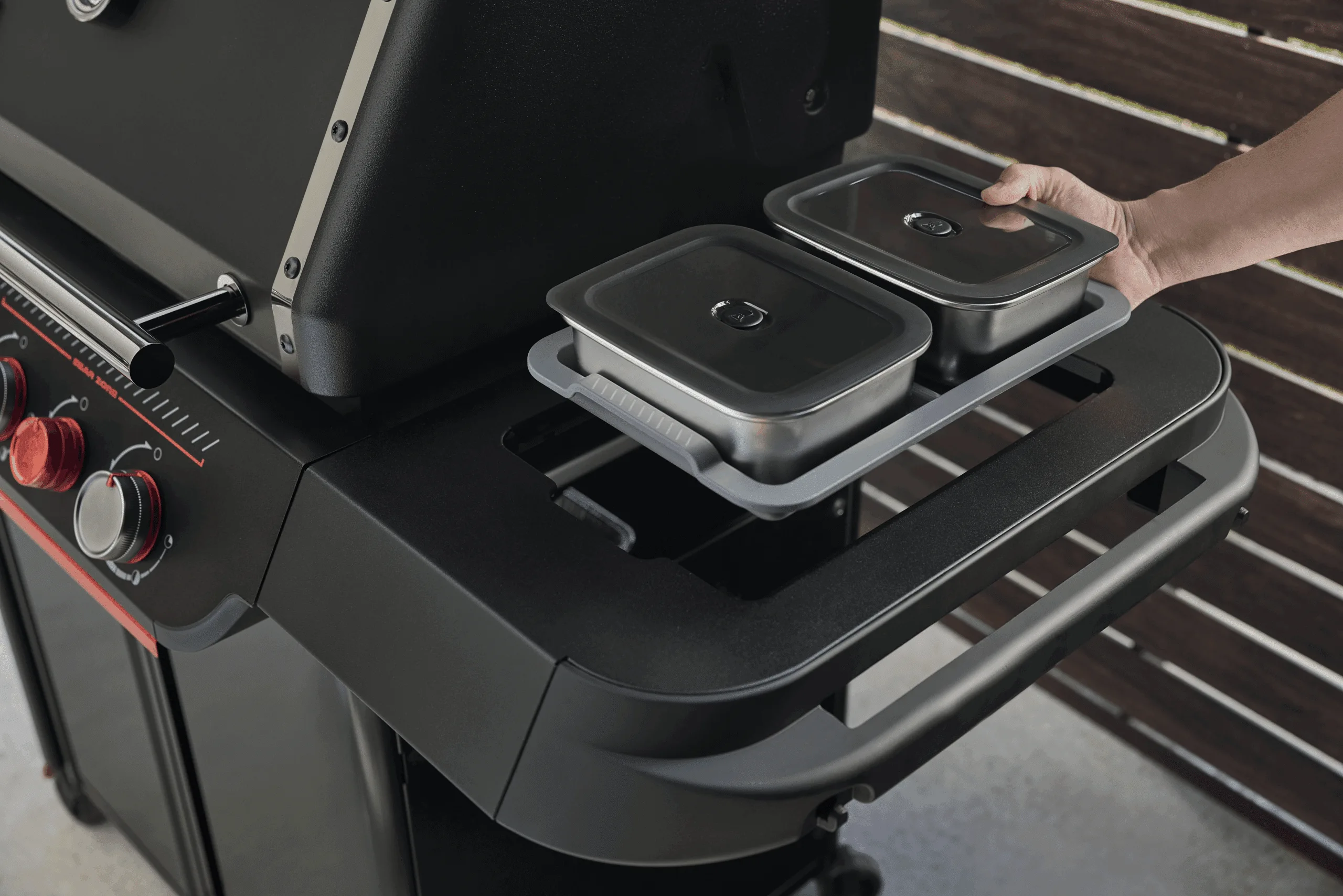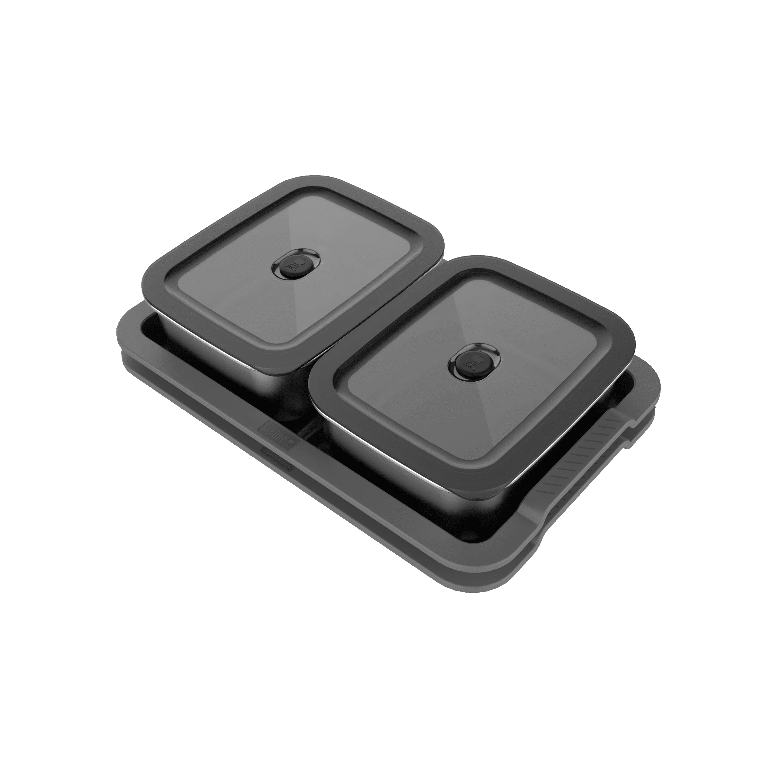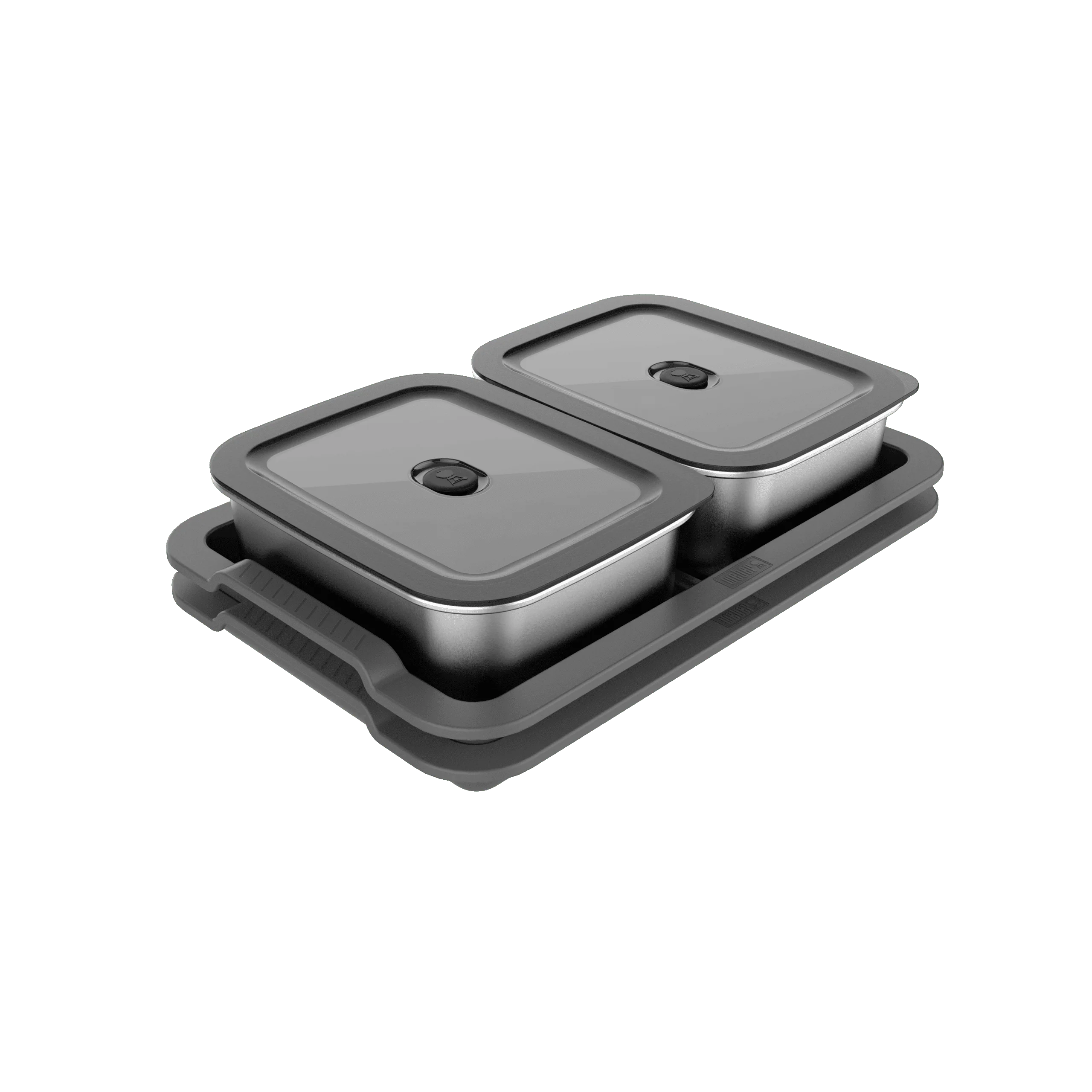 The kit includes two stainless steel prep containers with airtight, vented lids, each with a 1.8L capacity. These containers are ideal for storing marinated meats or chopped vegetables—keep them fresh, spill-free, and ready to go. The two divided serving trays drop directly into the Weber Works side table (on compatible Weber barbecues), giving you a clean and efficient workspace.