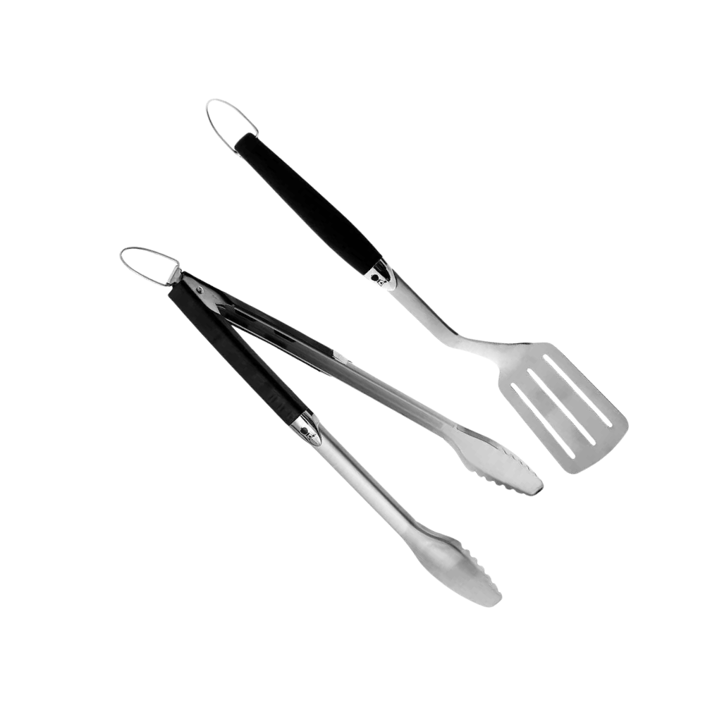 The Weber 2-Piece BBQ toolset includes a Spatula and Locking Tongs with easy-grip rubber handles.