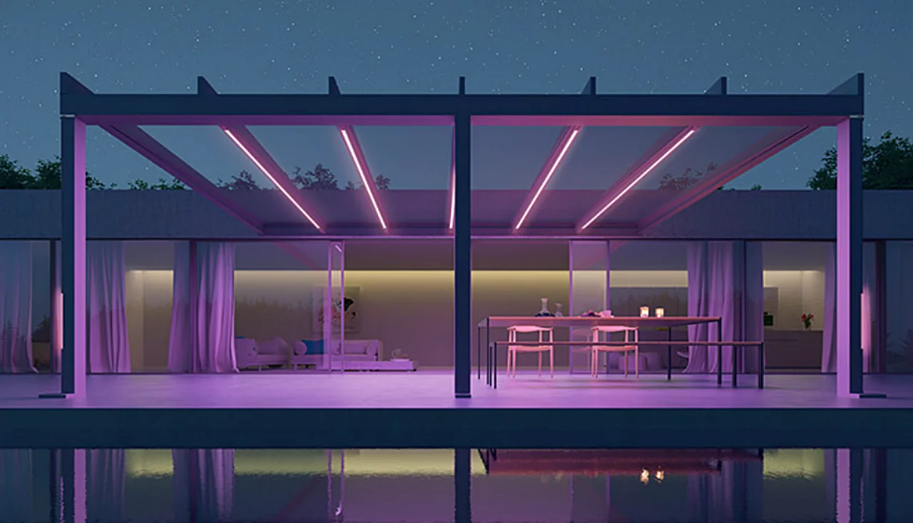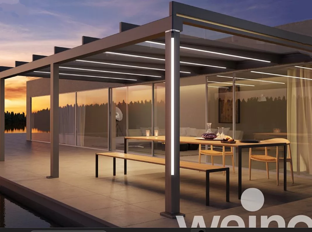 With a huge range of colour shades, the atmospheric light with its high-quality coloured LED strips in the posts and roof brackets create an individual ambiance under the patio roof.